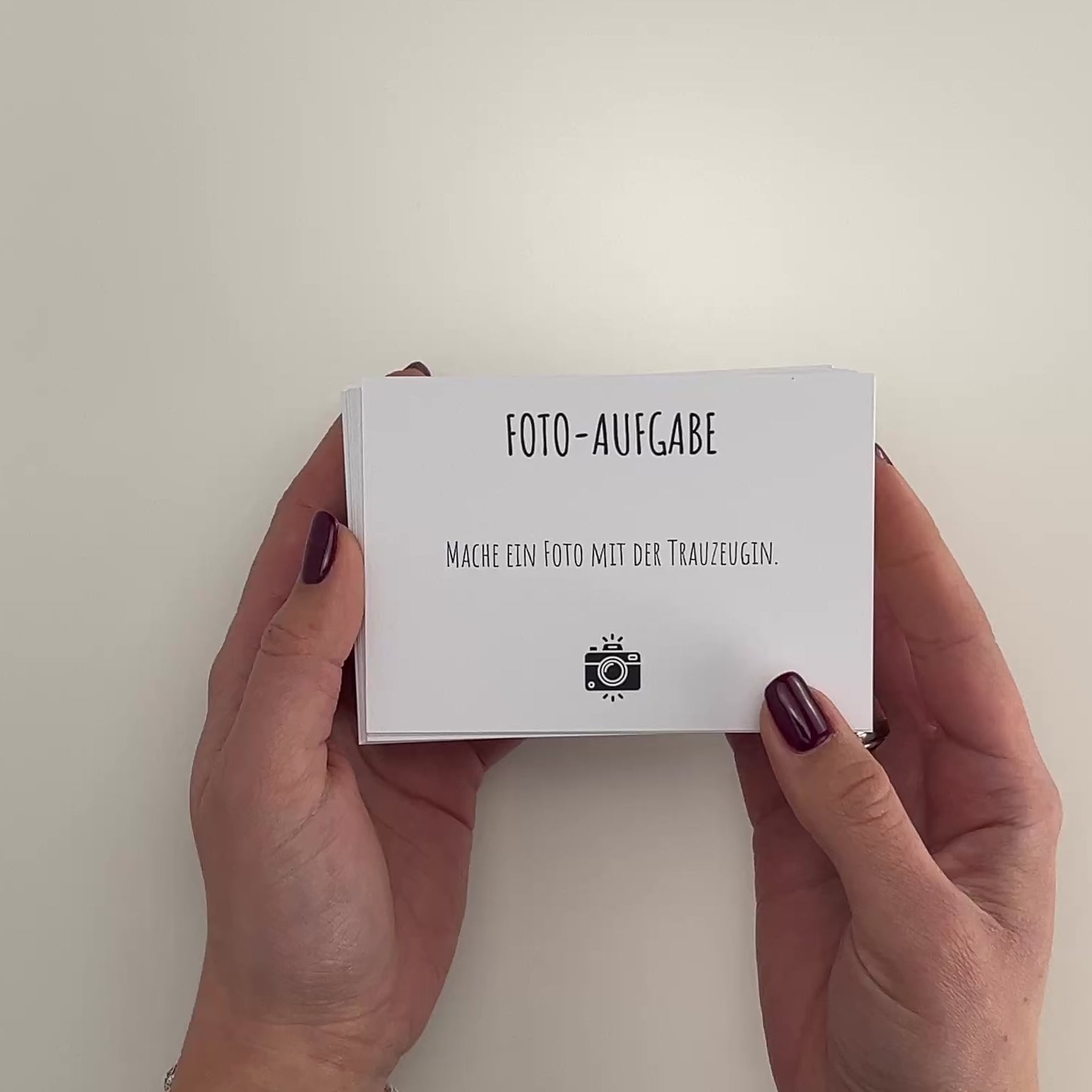 Verleihe deiner Hochzeit das gewisse Etwas! Unsere hochwertigen Fotoaufgaben sorgen für Spaß, einzigartige Erinnerungen und unvergessliche Momente. Mit insgesamt 100 Karten – darunter 90 kreative Aufgaben und 10 individuell gestaltbare DIY-Karten – wird dieses Partyspiel zum Highlight für alle Gäste.