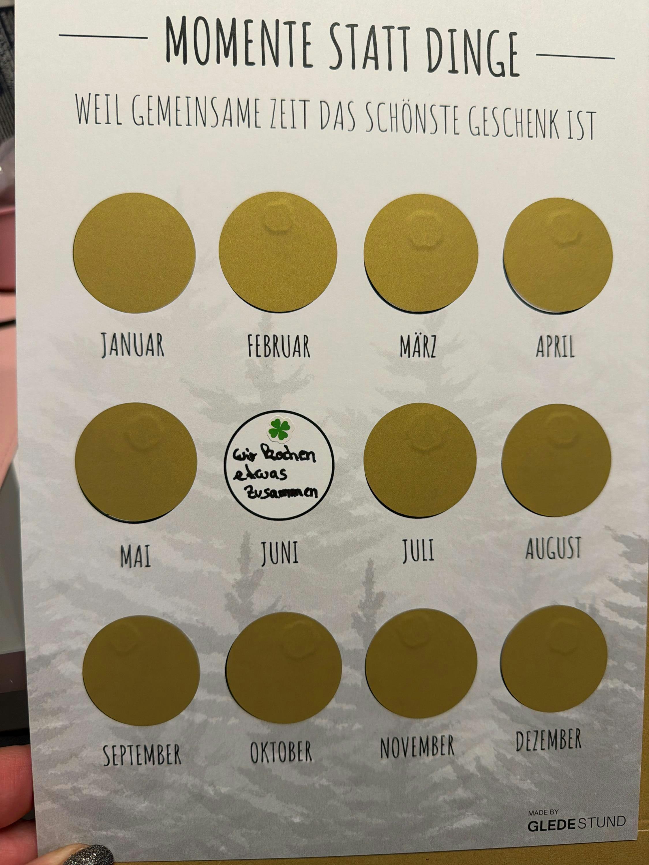 Auf DIN A4, 350 g Karton mit matter Oberfläche warten 12 goldene Rubbel-Sticker auf deine Ideen – ein Jahr voller Dates, Erlebnisse und gemeinsamer Zeit. Du füllst die Felder aus, klebst die Sticker auf und verschenkst einen Date-Kalender mit echter Vorfreude.